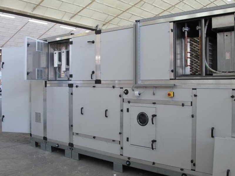 Al suo interno trova spazio una centrale trattamento aria TCF serie AZ studiata su misura e dotata di componentistica specifica, tra cui ventilatori plug fan dotati di variatori di velocità, rotativo dessiccante con abbinato ventilatore di espulsione condensa, recuperatore a piastre a flussi incrociati, batterie di scambio termico con collettori interni, nonché di quadro elettrico di termoregolazione per il controllo fine di temperatura e umidità, particolarmente importante per applicazioni nel ramo farmaceutico.